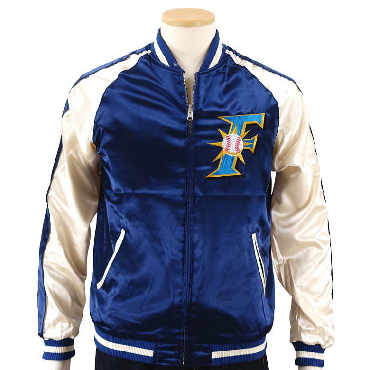 賑やかなスカジャンの裏側には、爽やかなブルーに北海道日本ハムファイターズのロゴが輝く、スタイリッシュなデザインが隠されています。