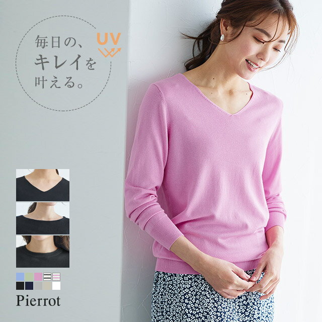\今だけ★特別price!/UVカット シルクタッチ ウォッシャブルニット 洗えるニット トップス レディース もっちり しっとり シンプル ボーダー Vネック ボートネック 長袖 M L 洗濯機OK ピエロ 【Pierrot】