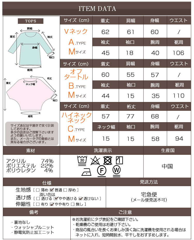SPEC カラー 【A.TYPE/Vネック】・杢モカ ・ドライピンク ・杢グレー ・杢チャコール 【B.TYPE/オフタートルワイド袖】・杢モカ ・ドライピンク ・ブルー ・杢グレー ・杢チャコール 【C.TYPE/ハイネックボリューム袖】・アイボリー ・ドライピンク ・杢チャコール 素材 アクリル74% ポリエステル22% ポリウレタン 2% サイズ 【Mサイズ】 ■A.TYPE/Vネック 着丈62cm 肩幅61cm 身幅60cm 袖丈45cm 袖口18cm 腕周40cm 裾周106cm ■B.TYPE/オフタートルワイド袖 着丈60cm 肩幅55cm 身幅57cm 袖丈44cm 袖口15cm 腕周35cm 裾周110cm ■C.TYPE/ハイネックボリューム袖 着丈57cm 裄丈77cm 身幅68cm ネック幅15cm 袖口15cm 腕周58cm 裾周94cm 備考 裏地なし ウォッシャブルニット 静電気防止加工ニット ご注意 ※お洗濯前にタグ表記をご確認下さい。