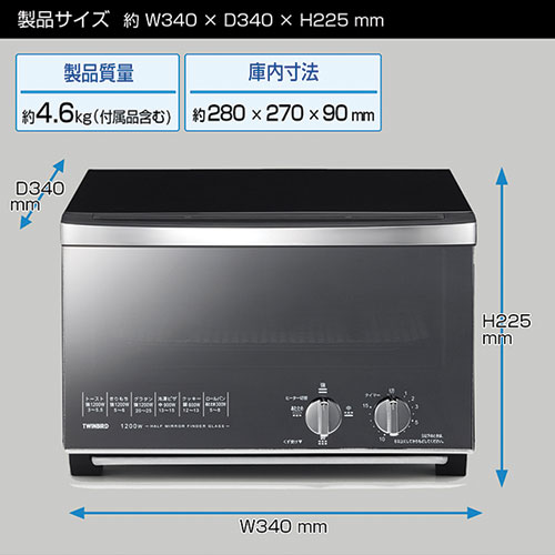 ■商品名 ミラーガラスオーブントースター ■品番 TS-D048B ■カラー ブラック ■製品寸法 約 340 × 340 × 225 mm ■製品質量 約 5.0 kg( 付属品含 ) ■電源 AC 100 V 50 / 60 Hz ■消費電力 1200 W ■出力切替 300 / 600 / 900 / 1200 W ■タイマー 約 15 分 ■電源コード長 約 1.4 m ■庫内寸法 約 280 × 270 × 90 mm ■ラック寸法 約 280 × 240 mm ■天板寸法 約 285 × 240 mm ( 積載可能寸法 約 265 × 220 mm ) ■付属品 天板 ■保証期間 1年間 ■ツインバード ミラーガラスオーブントースター ブラック TS-D048Bの関連商品はこちら クマザキエイム bearmax エアロオーブン AO-250 はこちら ウェルリッチ トンドリオーブン TD-4085Rはこちら