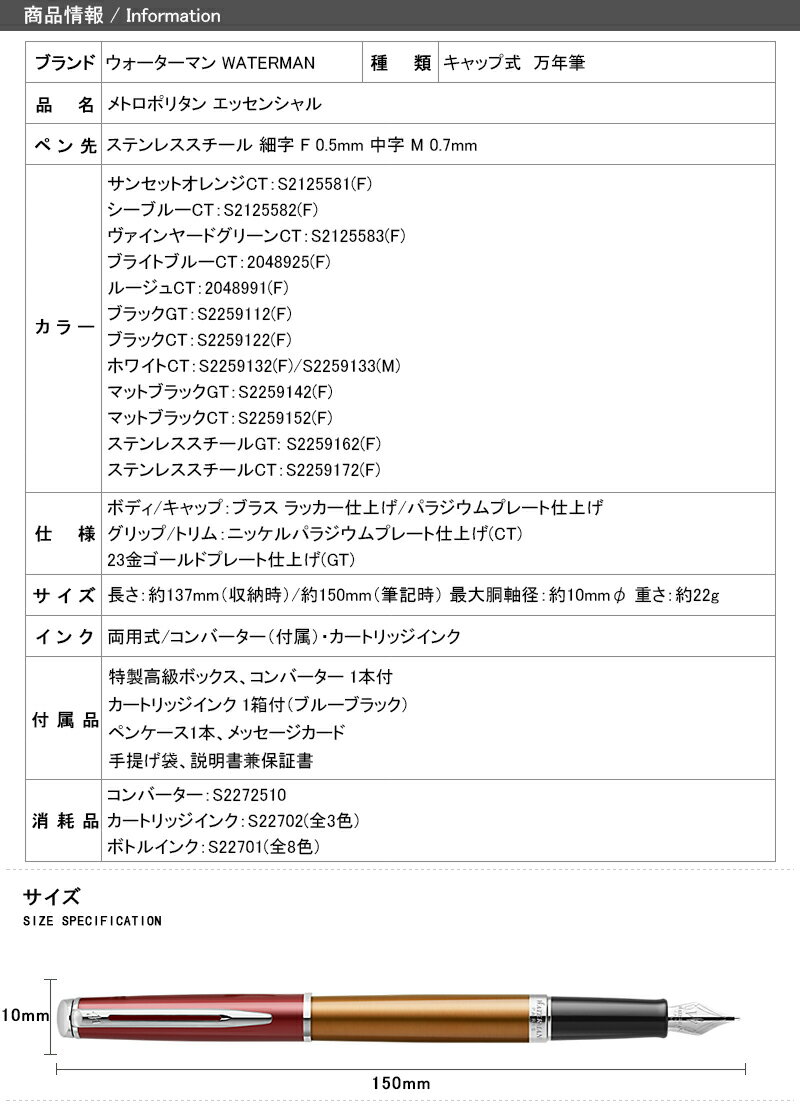【ブランド】 ウォーターマン WATERMAN 【品 名】 メトロポリタン エッセンシャル 【種 類】 キャップ式万年筆 【カ ラ ー】 サンセットオレンジCT:S2125581(F) シーブルーCT:S2125582(F) ヴァインヤードグリーンCT:S2125583(F) ブライトブルーCT:2048925(F) ルージュCT:2048991(F) ブラックGT:S2259112(F) ブラックCT:S2259122(F) ホワイトCT:S2259132(F)/S2259133(M) マットブラックGT:S2259142(F) マットブラックCT:S2259152(F) ステンレススチールGT: S2259162(F) ステンレススチールCT:S2259172(F) 【ペ ン 先】 ステンレススチール 細字 F 0.5mm 中字 M 0.7mm 【イ ン ク】 両用式/コンバーター・カートリッジインク 【サ イ ズ】 長さ:約137mm(収納時)/約150mm(筆記時) 最大胴軸径:約10mmφ 重さ:約22g 【仕 様】 ボディ/キャップ: ブラス ラッカー仕上げ/パラジウムプレート仕上げ グリップ/トリム: ニッケルパラジウムプレート仕上げ(CT) 23金ゴールドプレート仕上げ(GT) 【付 属 品】 特製高級ボックス コンバーター 1本付 カートリッジインク 1箱付(ブルーブラック) ペンケース1本 メッセージカード 手提げ袋 説明書兼保証書 【消 耗 品】 コンバーター:S2272510 カートリッジインク:S22702(全3色) ボトルインク:S22701(全8色) 【商品説明】 シンプルで飽きのこないフォルムが日常のあらゆるシーンにマッチする「メトロポリタン」。