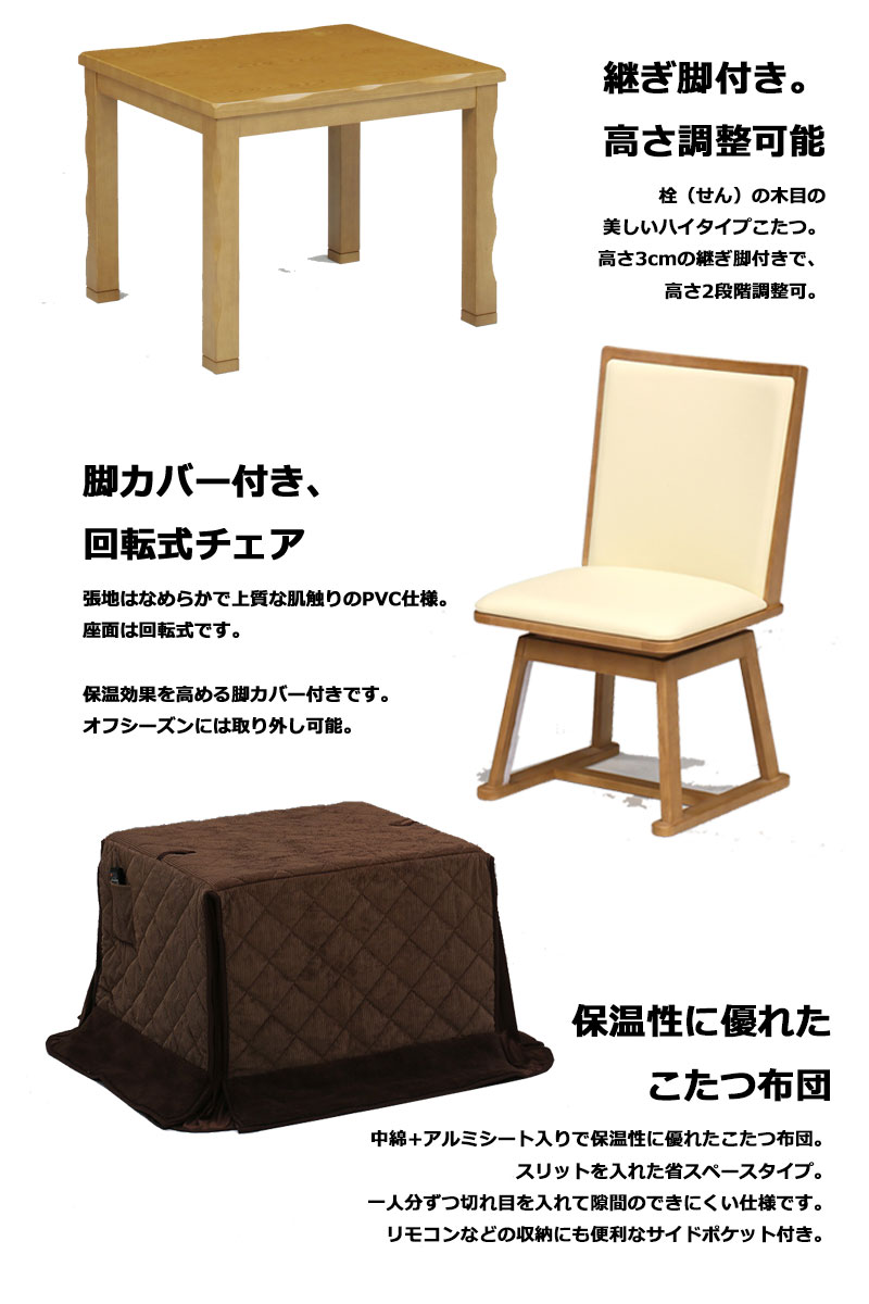 ■商品の特徴 90cm幅のダイニングこたつ2人掛け用の4点セット 3cmの継ぎ足付きで2段階の高さ調整が可能。