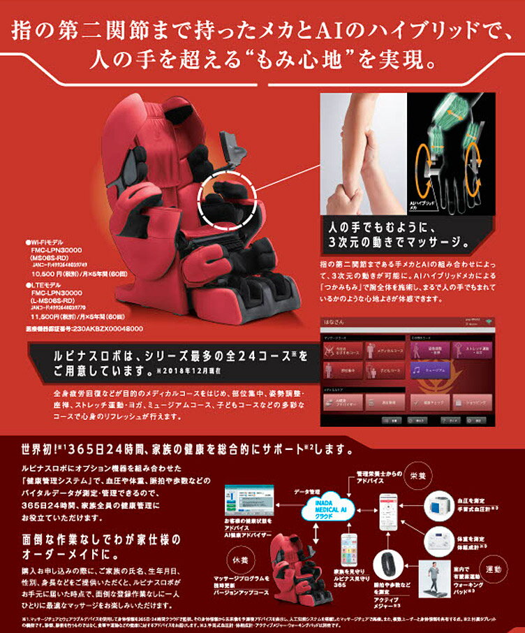 (提供)ファミリーイナダ 商品説明 名称 シャア専用ルピナスロボ Wi-Fiモデル 仕様 ●本体サイズ…幅100cm×高さ143cm(110cm)×奥行き143cm(217cm)※( )内の数字はフルリクライニング時の寸法 ●色展開…レッド ●外装布地…合成皮革 ●付属品…タブレット(10.1インチ)●もみ幅…最小2cm〜最大19.4cm ●リクライニング角度…水平面に対して約98°〜約155°無段階(電動リクライニング) ●音源の外部入力…有 ●使用電源…AC100V50-60Hz ●定格消費電力…270W(ヒーター使用時)ヒーターのみ動作時の定格消費電力38W ●重量…約115kg ●メーカー保証期間…5年間 ・ふるさと納税よくある質問はこちら ・寄付申込みのキャンセル、返礼品の変更・返品はできません。