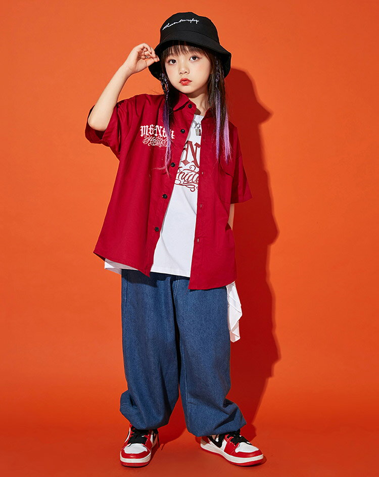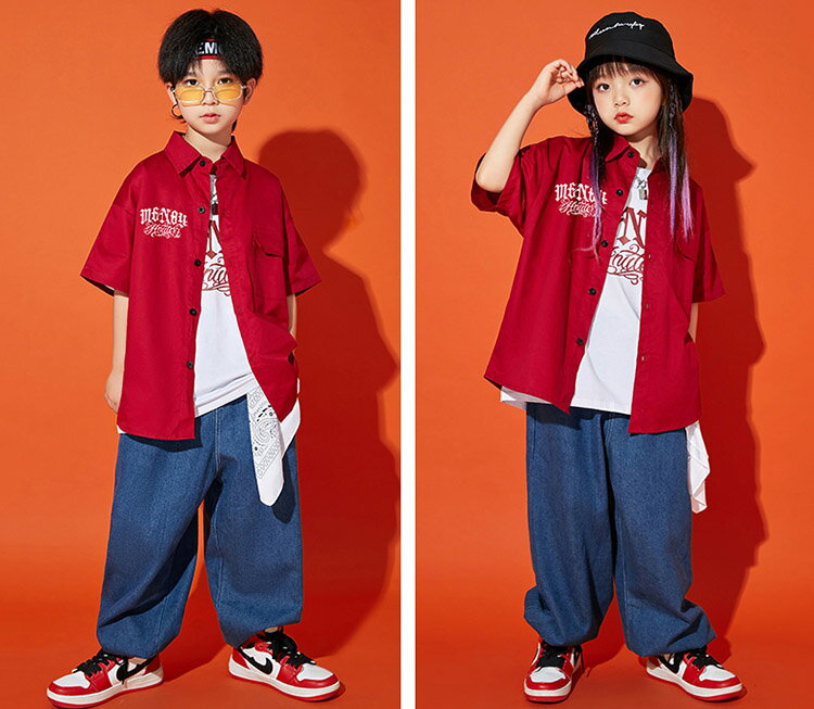 キッズ ダンス 衣装 セットアップ 花柄シャツ ヒップホップ 半袖 シャツ デニムパンツ ロングパンツ かっこいい 女の子 男の子 HIPHOP ジャズダンス 子供 ステージ衣装 韓国 ジュニア 応援団 イベント 発表会 文化祭 演出服110-180cm